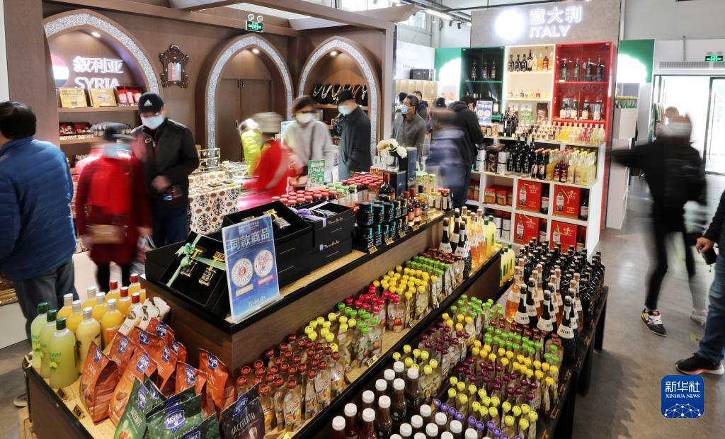 11月8日,顾客走过进博集市内一处进口酒水饮料集中展示台。