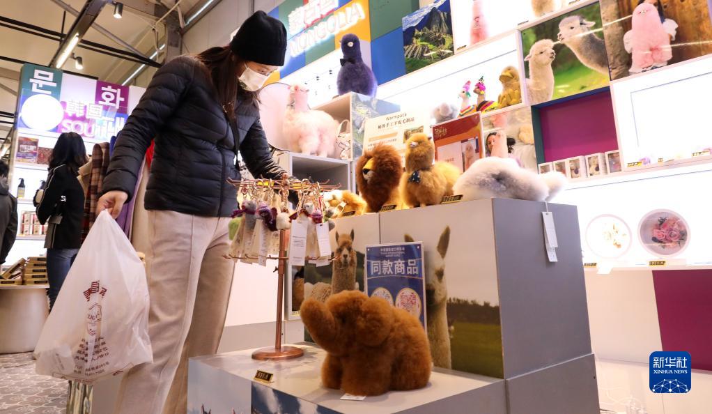11月8日,顾客在进博集市内抚摸由秘鲁羊驼毛制作的玩偶。