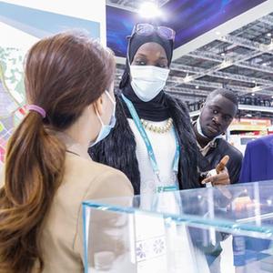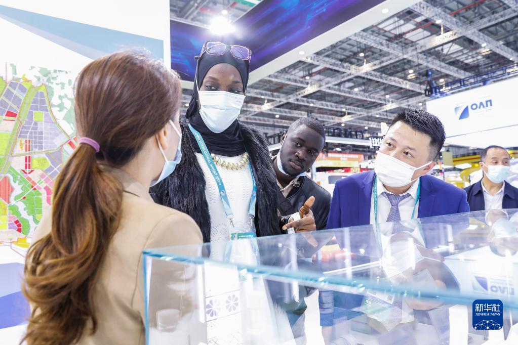 11月7日,来自冈比亚的参观者(中)在进博会服务贸易展区中白工业园展台了解参展商品。