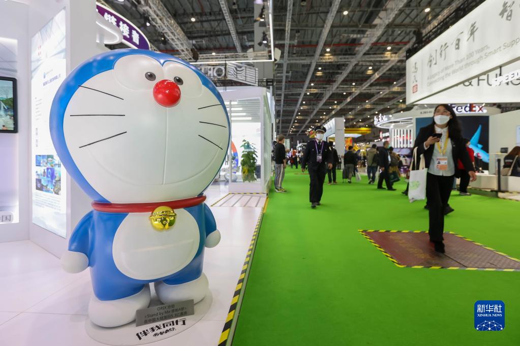 11月8日,人们经过第四届进博会服务贸易展区的哆啦A梦雕像。