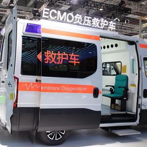 11月8日,在第四届进博会医疗器械及医药保健展区,一家公司展示新款ECMO负压救护车。