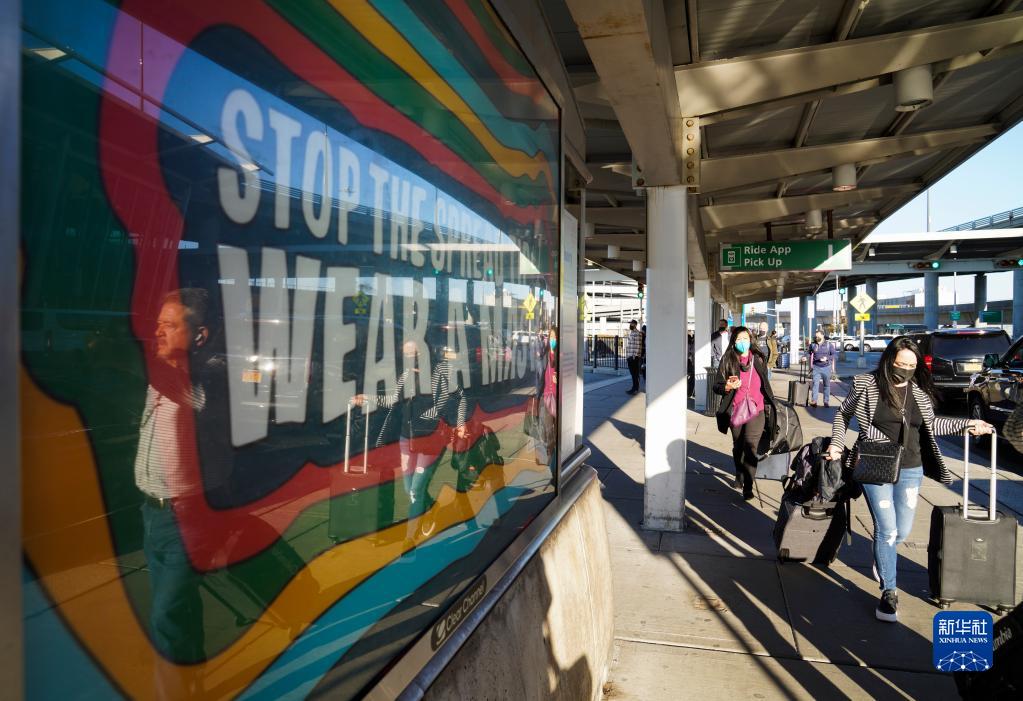 11月8日,在美国纽约肯尼迪国际机场,旅客从写着“戴上口罩 阻断传播”的广告牌旁走过。