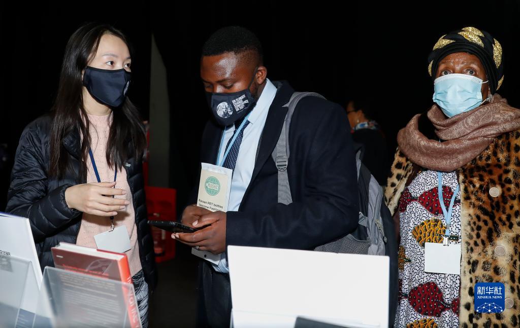 11月4日,在英国格拉斯哥联合国气候变化大会现场,志愿者柳珊(左)向参观者介绍中国企业馆。柳珊是亚洲商学院(麻省理工学院斯隆管理学院联办)工商管理硕士二年级学生,大会期间作为领队协调“绿色光年”志愿者参与中国企业馆的服务工作。