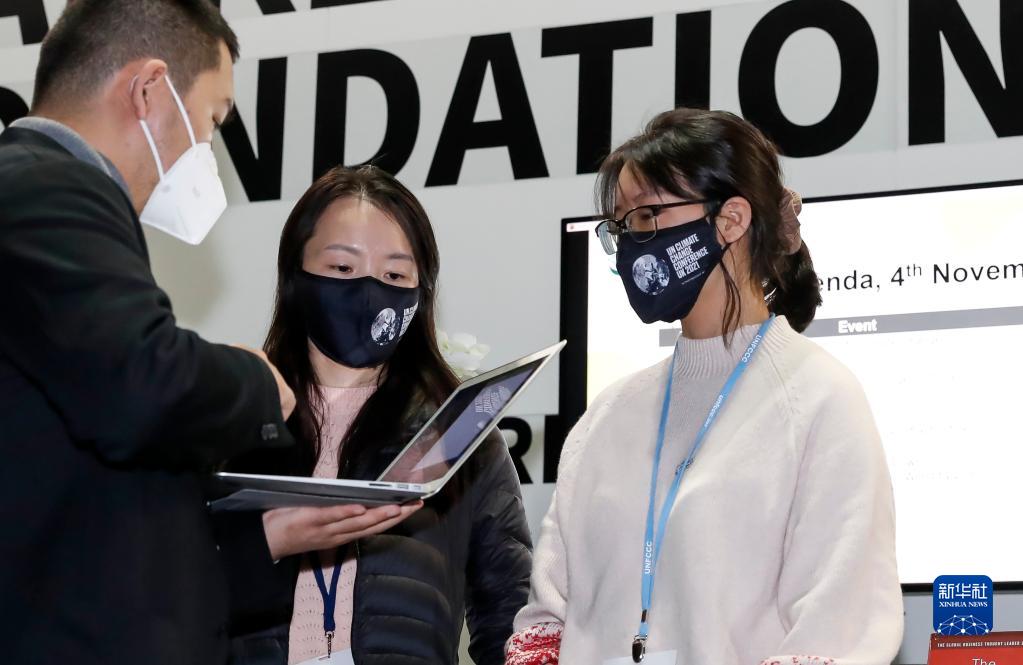 11月4日,在英国格拉斯哥联合国气候变化大会中国企业馆,志愿者柳珊(中)、张如苑(右)与工作人员交流。
