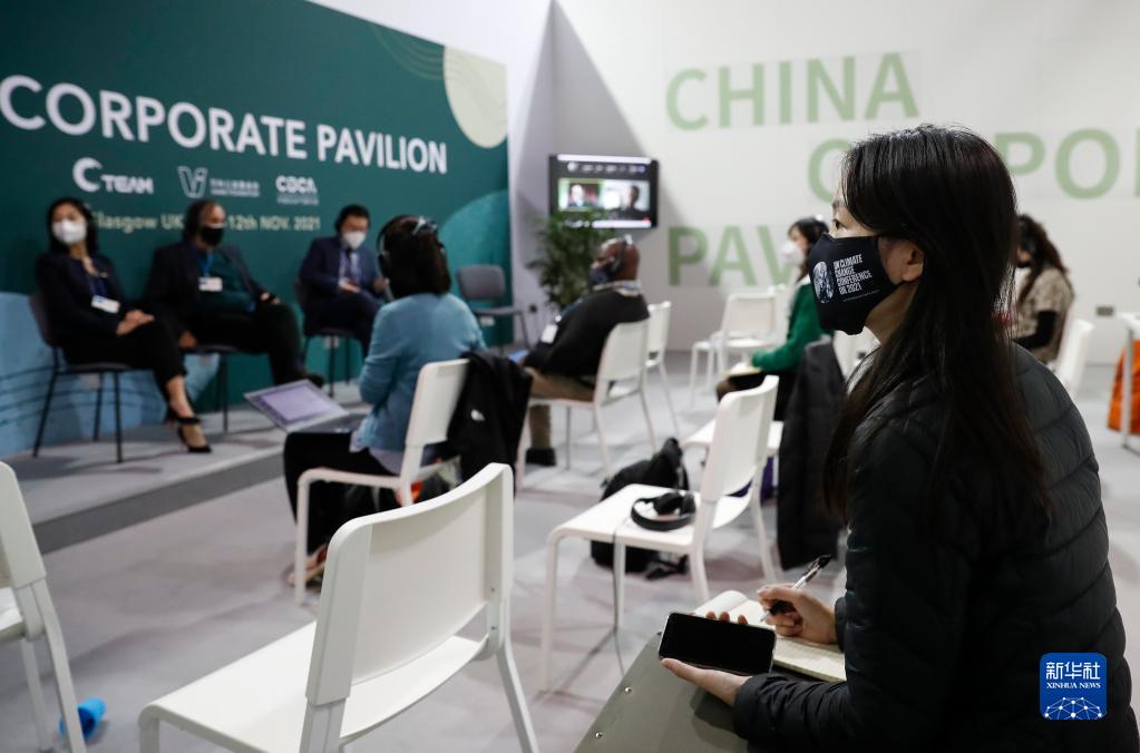 11月4日,在英国格拉斯哥联合国气候变化大会中国企业馆,志愿者柳珊(前)在做会议记录。柳珊是亚洲商学院(麻省理工学院斯隆管理学院联办)工商管理硕士二年级学生,大会期间作为领队协调“绿色光年”志愿者参与中国企业馆的服务工作。