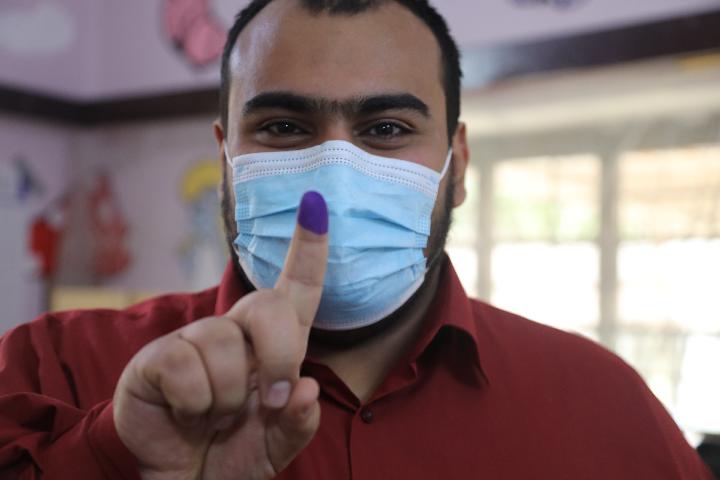 10月10日,一名伊拉克选民在巴格达参加新一届国民议会选举投票后展示蘸过墨水的手指。(新华社发)