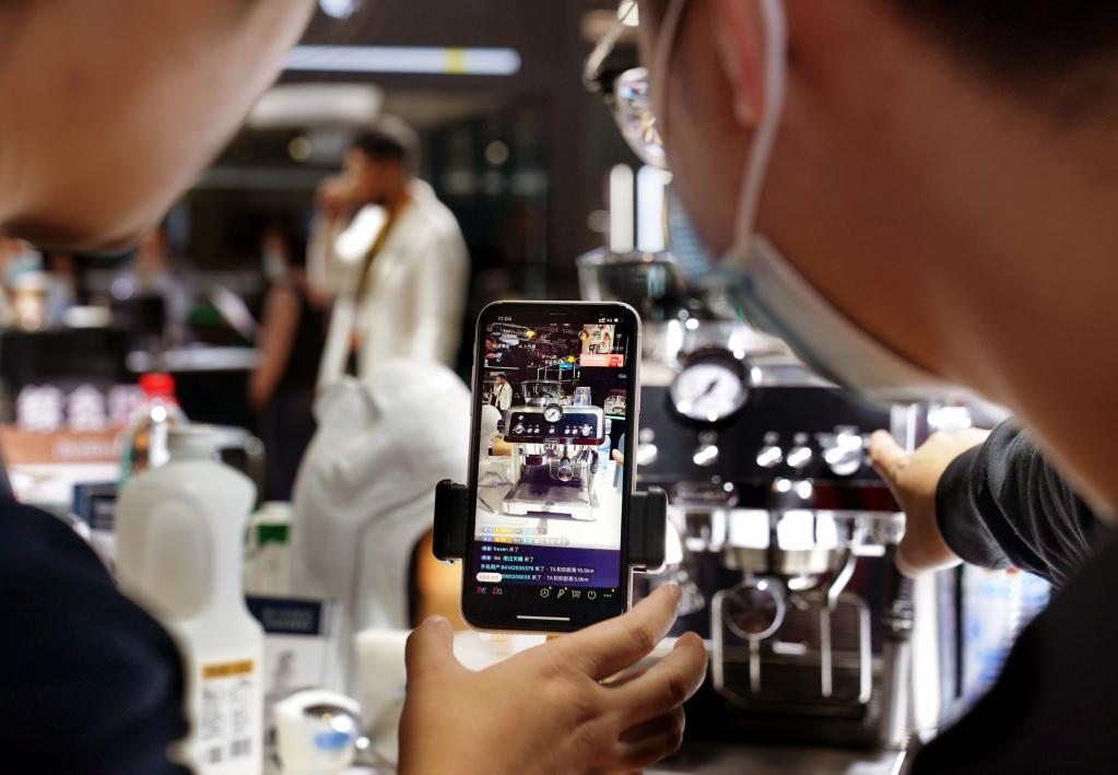 11月9日,在进博会消费品展区,展台的工作人员在电商平台进行咖啡机专场直播。