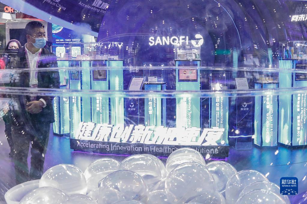 这是11月9日拍摄的进博会医疗器械及医药保健展区的法国赛诺菲展台。