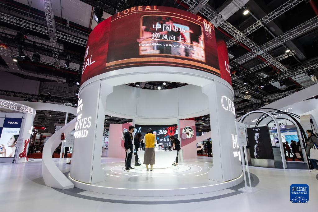 这是11月8日拍摄的进博会消费品展区的法国欧莱雅展台。