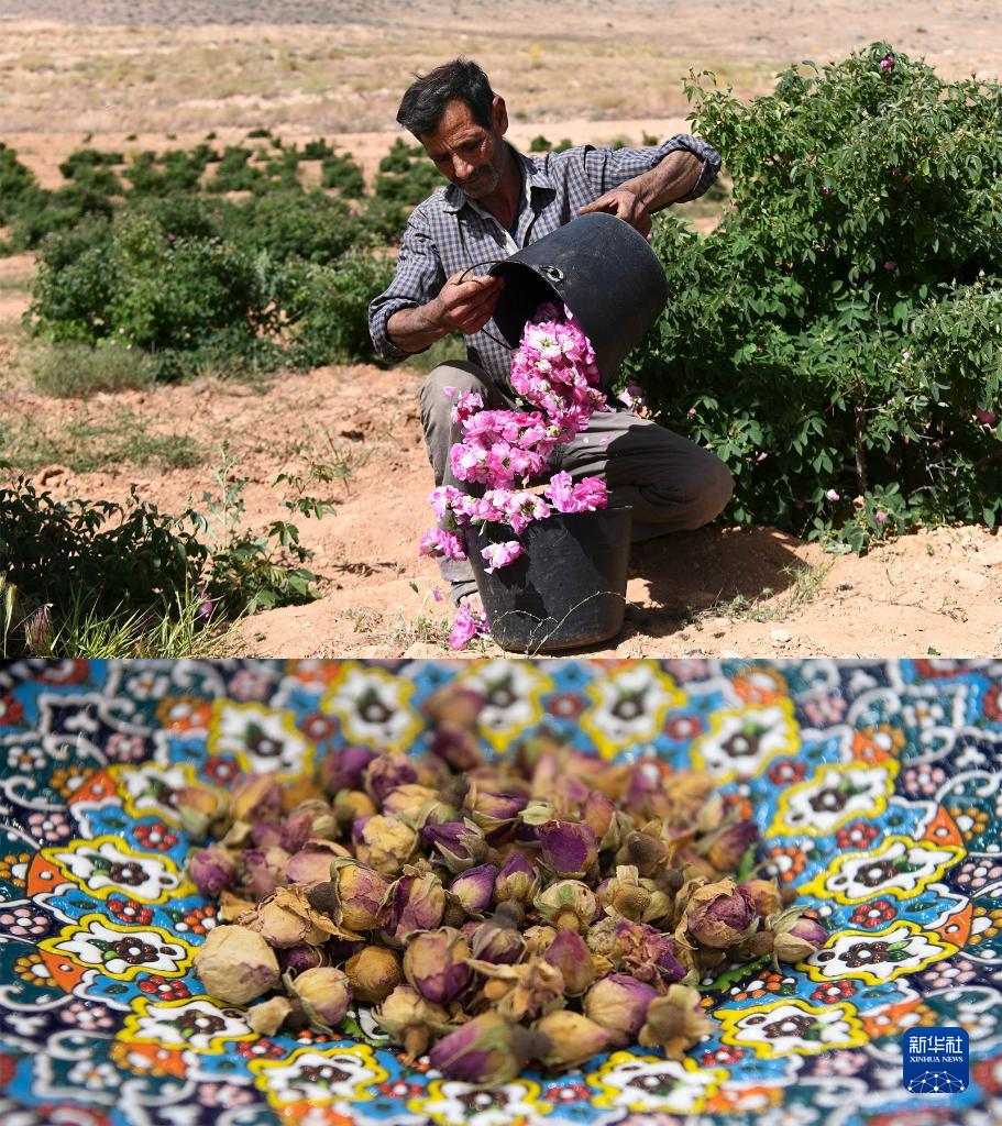 拼版照片:上图为2020年5月27日,一名男子在叙利亚大马士革北部采摘大马士革玫瑰(阿马尔·萨法尔贾拉尼摄);下图为2021年11月9日在第四届进博会食品及农产品展区拍摄的产自叙利亚的大马士革玫瑰花茶(新华社记者邬惠我摄)。