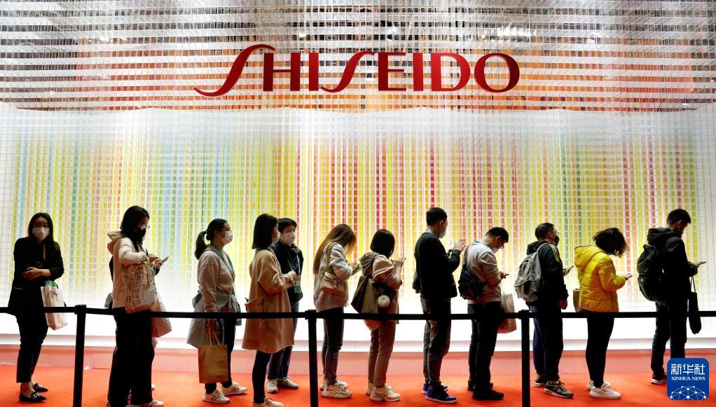 11月8日,在进博会消费品展区,参观者排队等待体验展品。