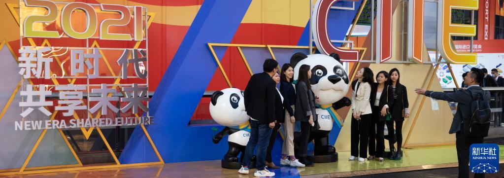 11月5日,参会者和进博会吉祥物“进宝”合影。