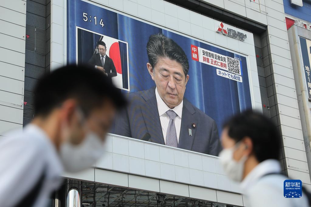 2020年8月28日,日本东京一处电子屏幕播放时任首相安倍晋三出席记者会的画面。安倍当天宣布辞去首相职务。(新华社记者 杜潇逸 摄)