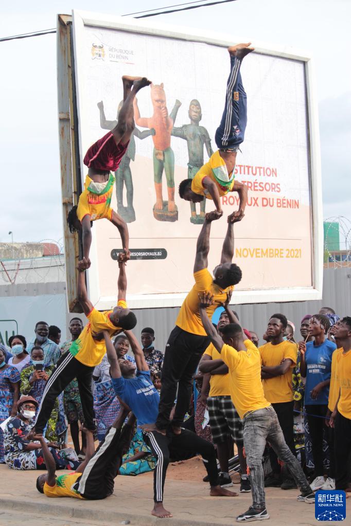 11月10日,人们在贝宁科托努机场附近表演杂技,庆祝文物回归。