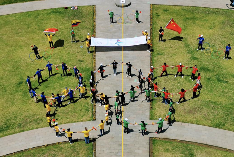 活动中,参与者穿着五色服装手拉手摆出奥运五环图案,当地舞者表演了代表着喜庆和祝福的民族舞蹈。活动最后,中外参与者用中文喊出了活动的口号:“中国加油,北京加油,体育健儿加油,一起向未来!”