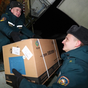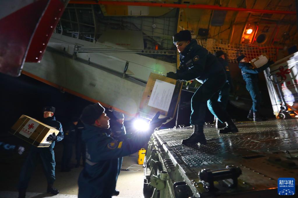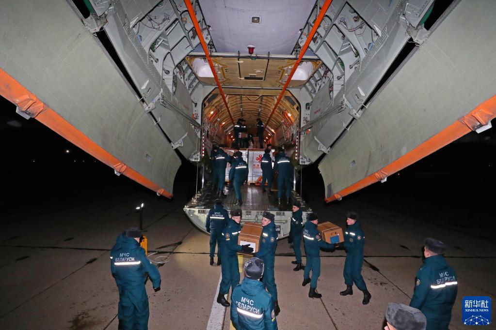 11月11日凌晨,工作人员在白俄罗斯明斯克搬运中国援助的物资。新华社发(任科夫 摄)