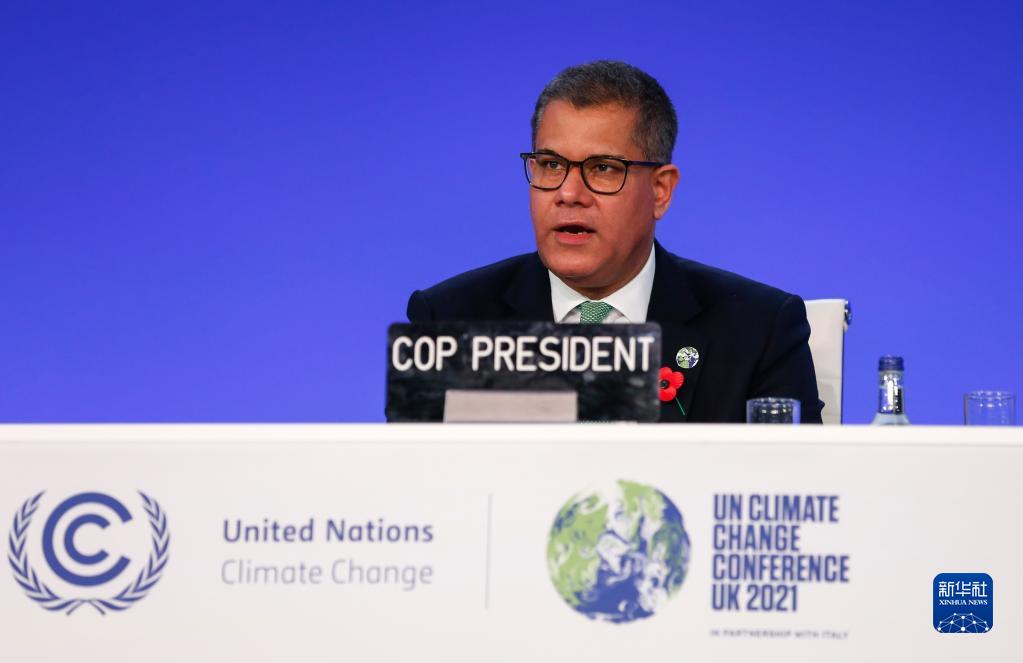 11月13日,《联合国气候变化框架公约》第26次缔约方大会主席夏尔马在英国格拉斯哥举行的大会上发言。