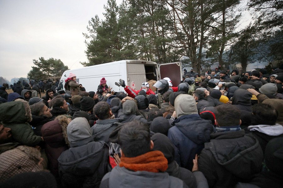 2021年11月13日,在白俄罗斯格罗德诺地区,难民领取救援物资。(新华社/路透)