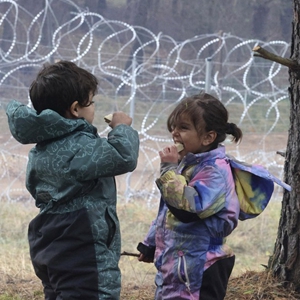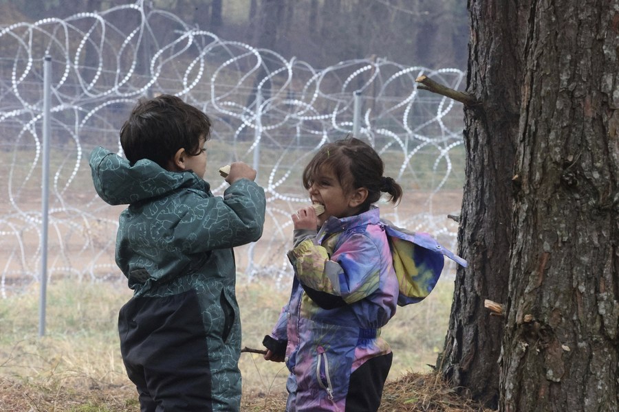 2021年11月13日,孩子们在白俄罗斯格罗德诺地区边境地带的铁丝网前吃东西。(新华社/美联)