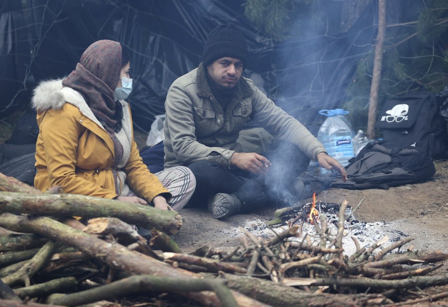 2021年11月11日,在白俄罗斯格罗德诺的边境处,难民在营地内烤火。(新华社/美联)