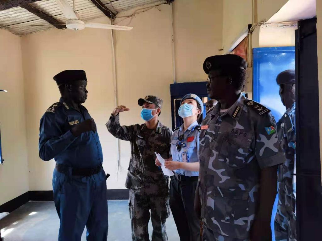 中国维和警察同南苏丹警察检查修葺一新的“东兴派出所”。(受访者供图)