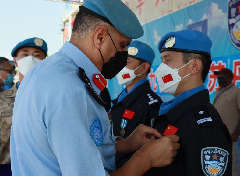 中国第九支赴南苏丹维和警队由10名队员组成,目前在南苏丹的朱巴和瓦乌地区执行维和任务。10月26日,联合国驻南苏丹特派团(联南苏团)代表联合国向中国第九支赴南苏丹维和警队全体队员授予联合国“和平勋章”,以表彰他们在南苏丹执行维和任务期间作出的突出贡献。