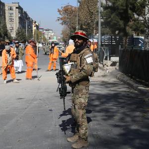 11月15日,阿富汗塔利班安全人员站在首都喀布尔的爆炸现场。