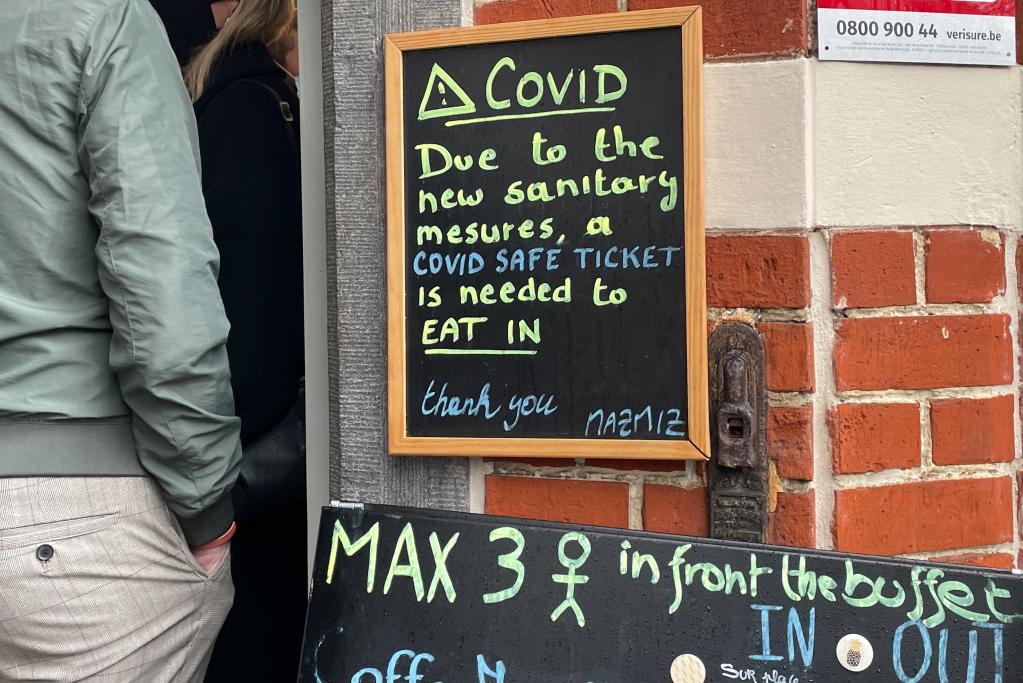 11月5日,比利时布鲁塞尔一家餐馆挂出“出示健康证明”和限流的告示牌。新华社记者 郑焕松 摄