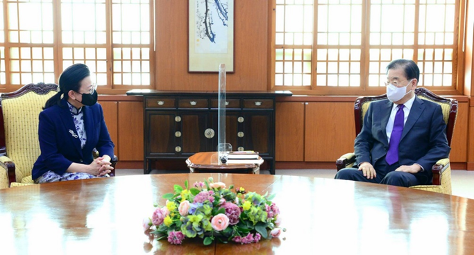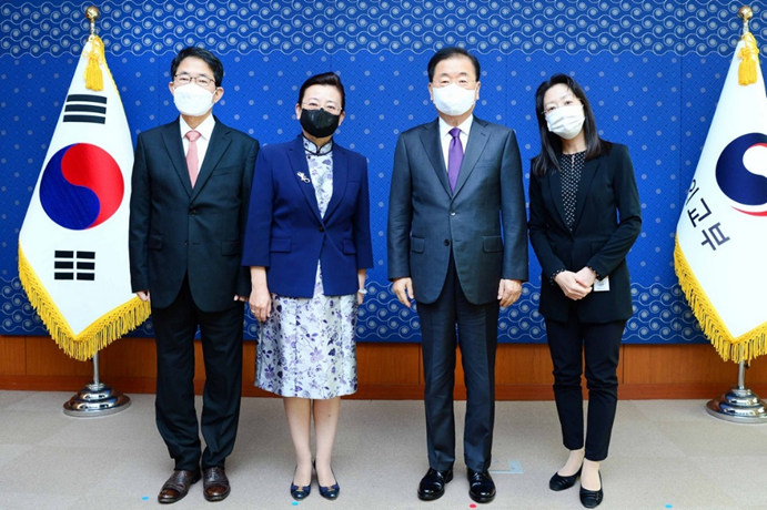 中日韩合作秘书处秘书长欧渤芊与韩国外长郑义溶交谈。(中日韩合作秘书处供图)