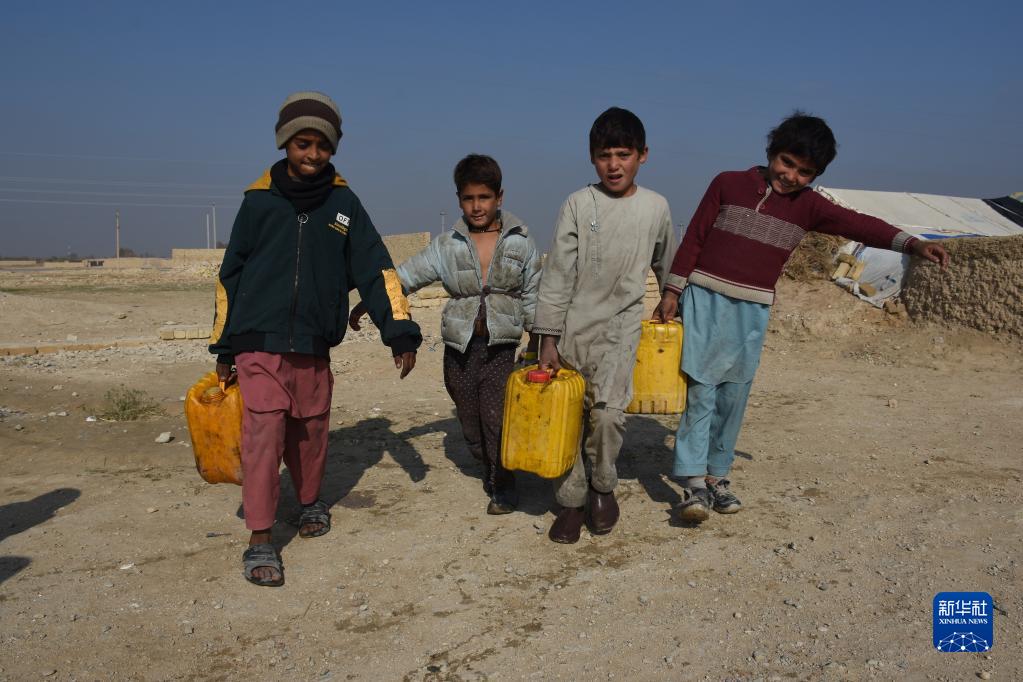 11月20日,在阿富汗马扎里沙里夫一处流离失所者营地,几名孩子打水归来。新华社发(卡瓦·巴沙拉特摄)