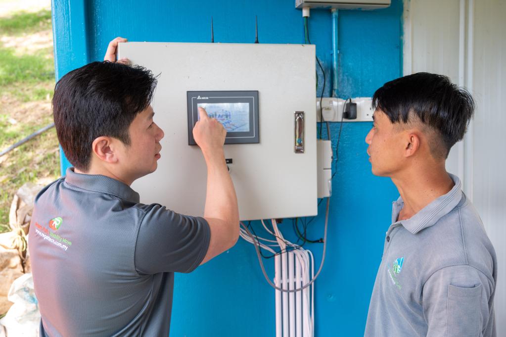 11月21日,在马来西亚彭亨州劳勿,“山姆猫山王榴莲园”园主梁沛鑫(右)与历佳德有限公司总经理庄恺靖在榴莲云物联网水肥控制器旁交谈。新华社记者朱炜摄