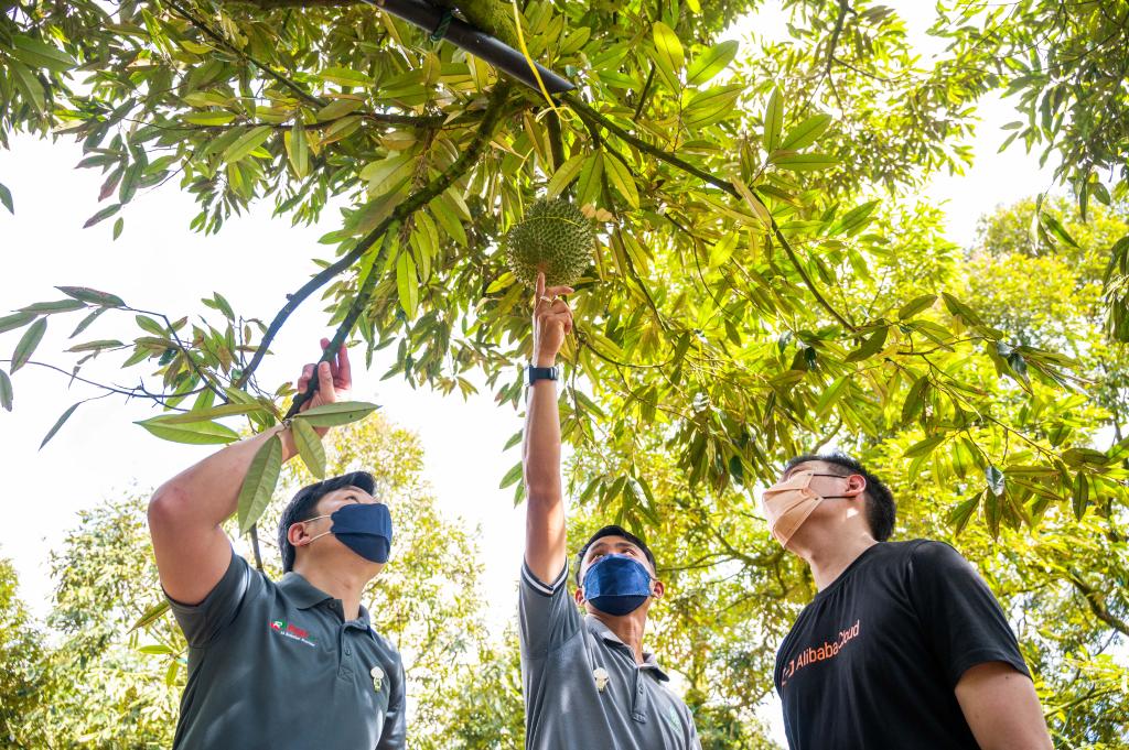 11月21日,在马来西亚彭亨州劳勿,“山姆猫山王榴莲园”园主梁沛鑫(中)、历佳德总经理庄恺靖(左)和阿里云工作人员曹国廷查看榴莲生长情况。新华社记者朱炜摄