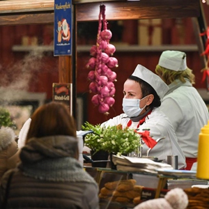 11月22日,在德国法兰克福“圣诞市场”,戴口罩的工作人员为顾客服务。(新华社记者 逯阳 摄)