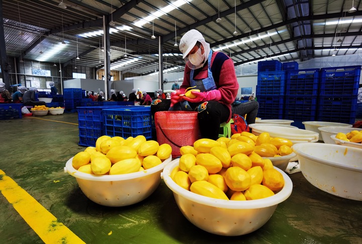 中宝(柬埔寨)食品科技有限公司的芒果干加工厂就坐落在磅士卑省尖山县上万公顷芒果园中。记者走进加工车间前,要先消毒、佩戴口罩、帽子和卫生面罩。厂房内,原料堆放、清洗消毒、削皮切片、糖渍烘干等功能区有序分布。一颗颗芒果在熟练工人手里,只见削皮刀上下翻飞,只需数秒就完成了削皮工序。