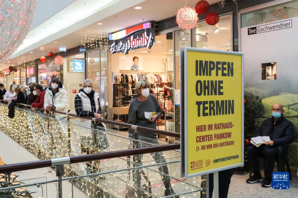 11月25日,在德国首都柏林的一座购物中心内,人们排队等候进入新冠疫苗接种站接种疫苗。 新华社记者 单宇琦 摄