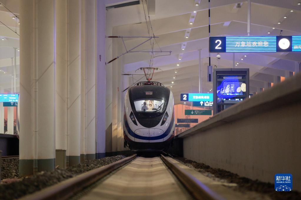 11月21日,在老挝首都万象,“澜沧号”动车组停靠在中老铁路万象站。