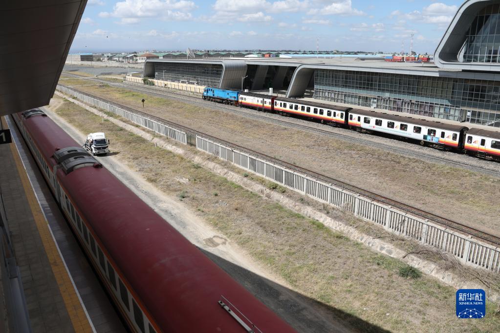 11月17日,在肯尼亚蒙内铁路内罗毕站,刚从客运列车下车的乘客乘坐接驳列车(右)准备前往内罗毕市中心,停靠在站内的客运列车(左)即将发往蒙巴萨。