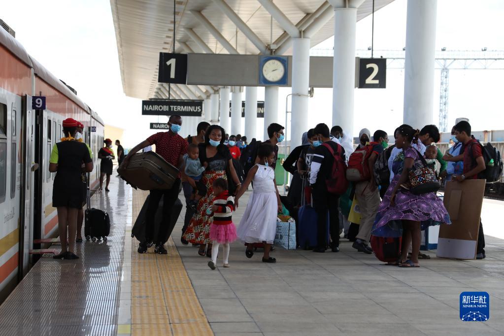 11月17日,在肯尼亚蒙内铁路内罗毕站,乘客从始发于蒙巴萨的客运列车上下车。