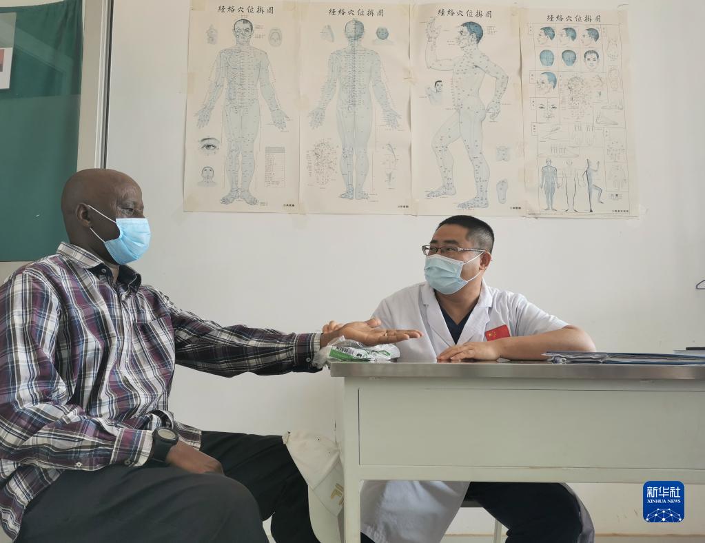 8月31日,在卢旺达首都基加利市郊的马萨卡医院,中国援卢医疗队中医戴军有(右)为一名患者把脉。