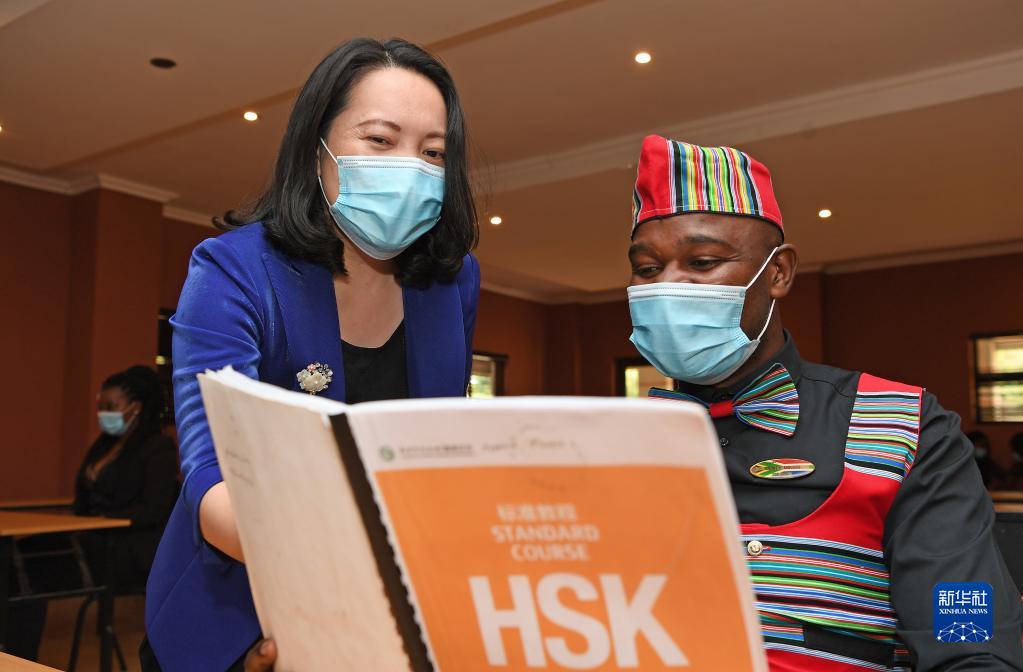 3月18日,约翰内斯堡大学孔子学院院长彭奕在南非比勒陀利亚为参加中文培训课的学员解答疑惑。