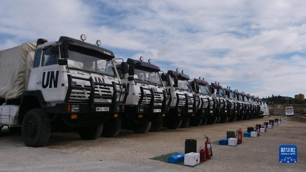 11月26日,在黎巴嫩南部辛尼亚村中国维和营,车辆等装备等待联黎部队司令部核查。新华社发(梁裕源 摄)