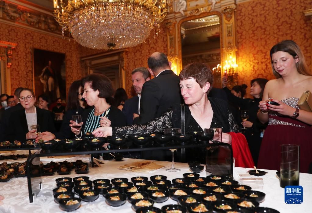 11月29日,在位于巴黎的法国外交部举行的LA LISTE国际美食榜单揭晓活动现场,来宾在巴黎中餐馆“幸福楼”的摊位前品尝美食。
