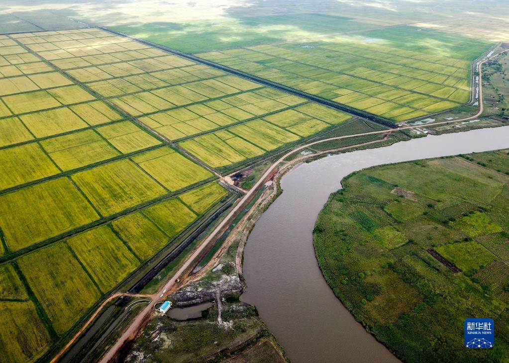 这是2019年4月7日无人机拍摄的莫桑比克万宝莫桑农业园的水稻田。万宝莫桑农业园是中国在非洲最大规模水稻种植项目,极大地缓解了莫桑比克粮食短缺问题。新华社记者 张宇 摄