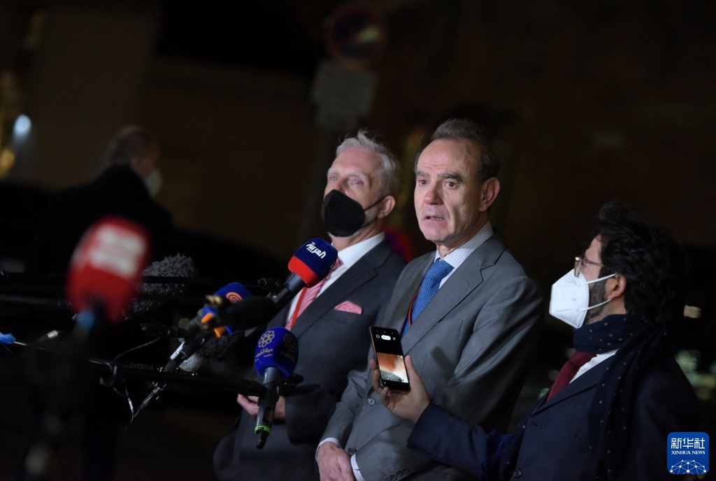 11月29日,欧盟对外行动署副秘书长莫拉(右二)在奥地利维也纳伊朗核问题全面协议联合委员会政治总司长级会议后接受采访。(新华社记者郭晨摄)