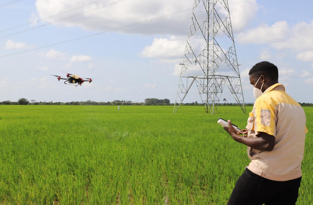 6月2日,在乌干达卡隆古区卢卡亚镇中亿农业园,作业员赫伯特·阿加巴操控植保无人机喷洒农药。新华社记者张改萍摄