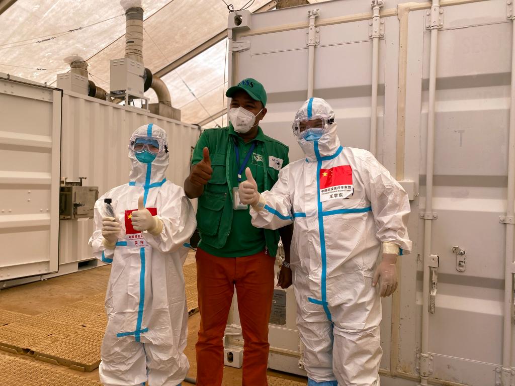 2020年9月2日,在几内亚首都科纳克里一个核酸检测取样点,中国抗疫医疗专家组成员与当地工作人员合影。新华社发(专家组供图)