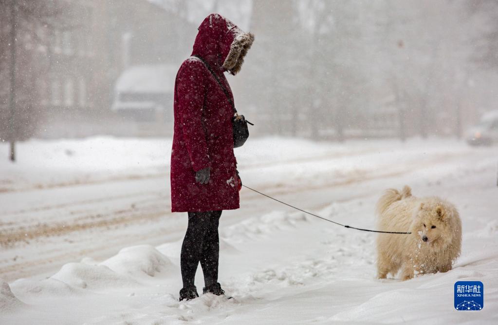 12月1日,行人在拉脱维亚里加的雪中遛狗。