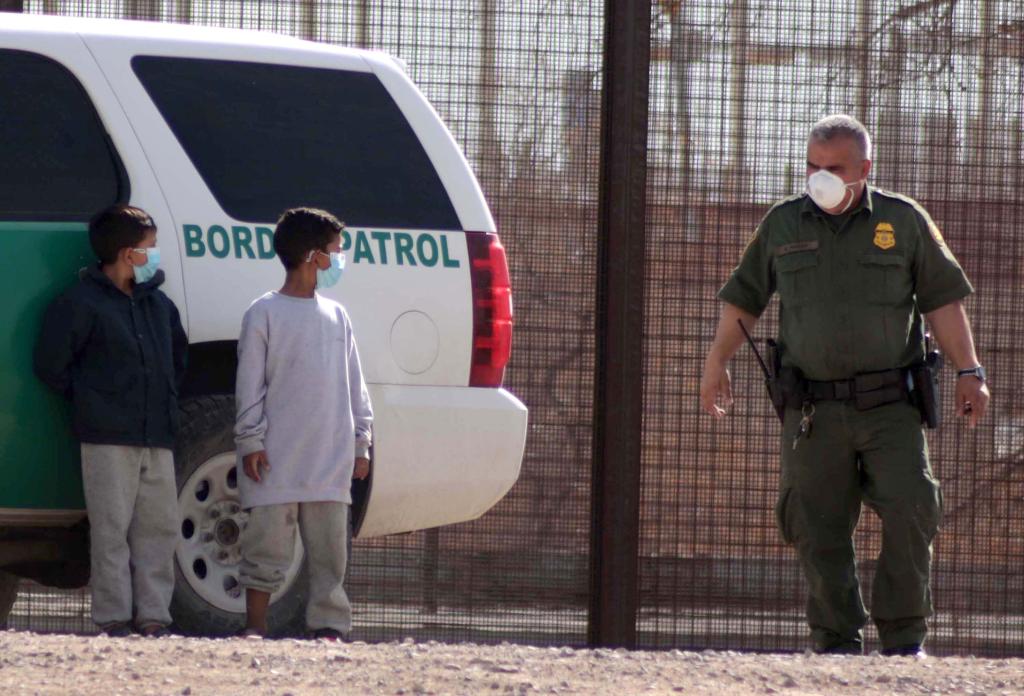 3月27日在墨西哥华雷斯拍摄的照片显示,两名来自危地马拉的移民儿童在跨越美墨边境的里奥格兰德河后,等待接受美国边境巡逻队人员的处理。新华社发(戴维·佩纳多摄)