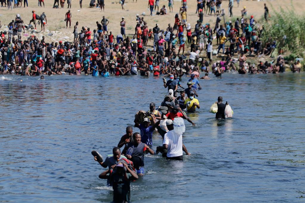 9月19日在墨西哥科阿韦拉州阿库尼亚城拍摄的照片显示,非法移民走过美墨边境的里奥格兰德河,进入墨西哥一侧购买食物和生活必需品。新华社发
