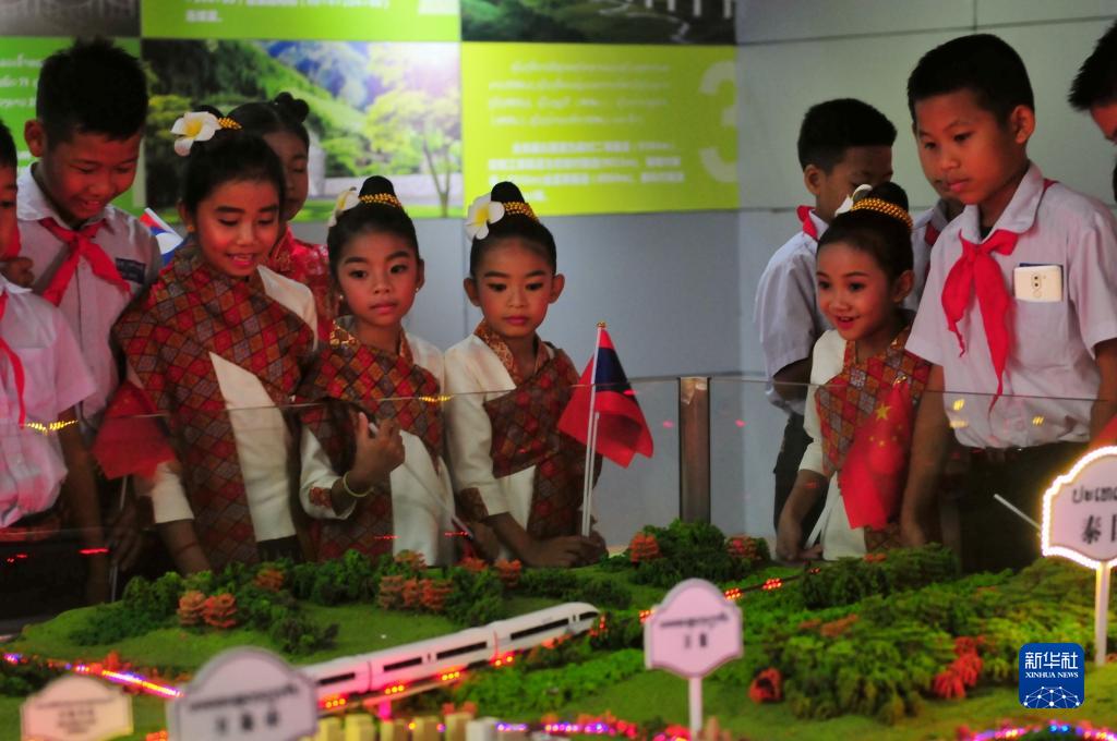2019年6月1日,在老挝万象,中老友好农冰村小学学生参观中老铁路展示馆。新华社记者 章建华 摄